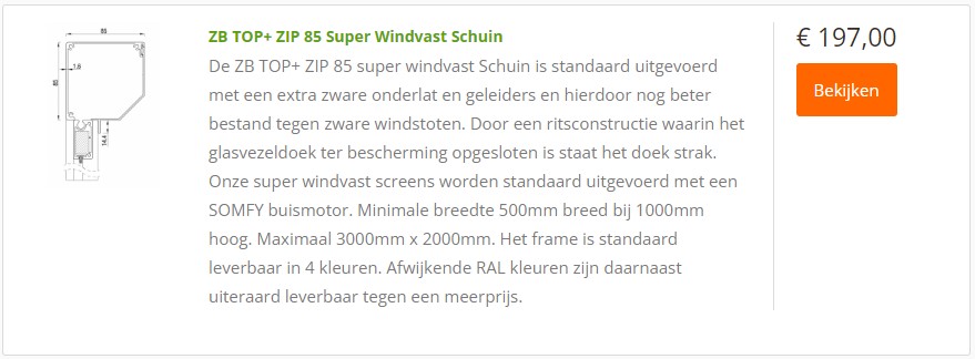ZIP TOP+ screens gaan nog iets verder, wanneer het gaat om stevigheid. Deze screens zijn namelijk ook geschikt voor de wat "guurdere" weertypes. Dit maakt ze dan ook bijvoorbeeld geschikt voor plaatsing bij kustgebieden en hoge gebouwen. De screens prijzen zijn iets hoger, maar wanneer u er zeker van wilt zijn dat uw screen tegen een net iets zwaarder stootje kan, dan zijn de ZIP TOP+ screens het juiste paard om op te wedden.